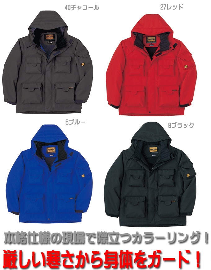 従来のワークカラーとは違う、際立つカラーリングで他を圧倒!もちろん機能も充実! ●耐水圧5000mm以上、透湿性5000g/m2以上など、本格機能の防寒コートです。