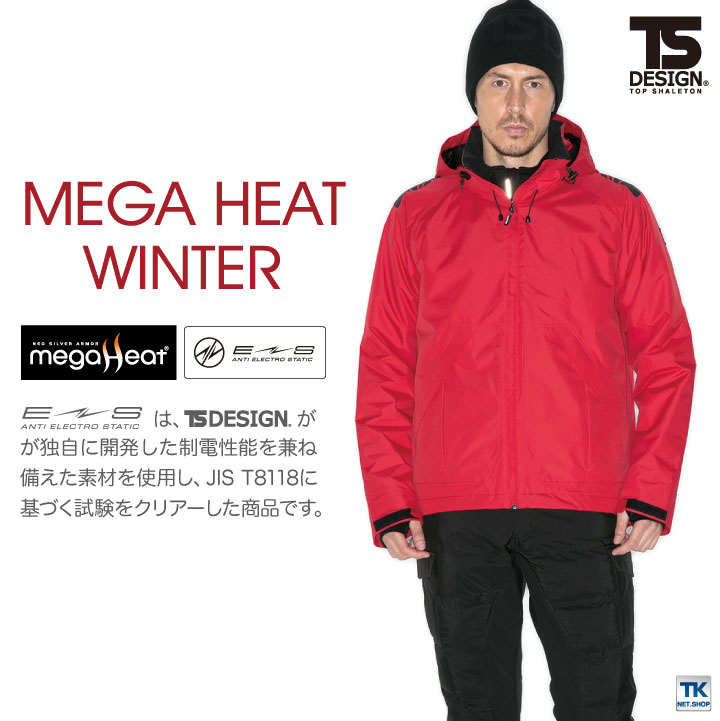 TS DESIGN MEGA HEAT 防水防寒ジャケット 商品の特長 防水、撥水、透湿、制電機能が備わった ハイブリッドな防寒ジャケット! スタイリッシュで軽量なのに暖かく、 肩と腰部分には補強、収納可能な フードも付いており、寒い季節に 強い味方のワークウェアです。