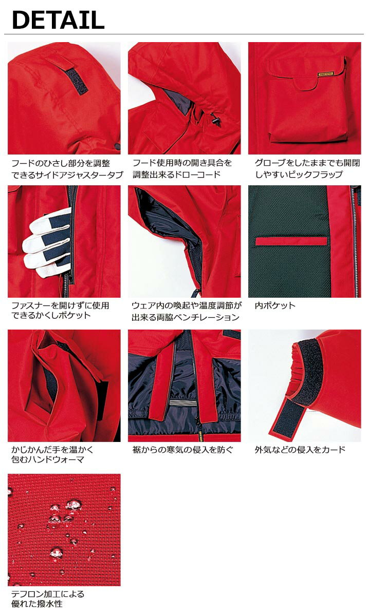 従来のワークカラーとは違う、際立つカラーリングで他を圧倒!もちろん機能も充実! ●耐水圧5000mm以上、透湿性5000g/m2以上など、本格機能の防寒コートです。
